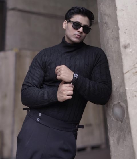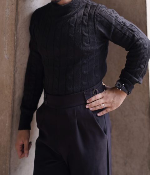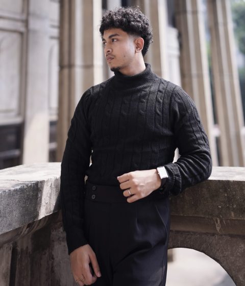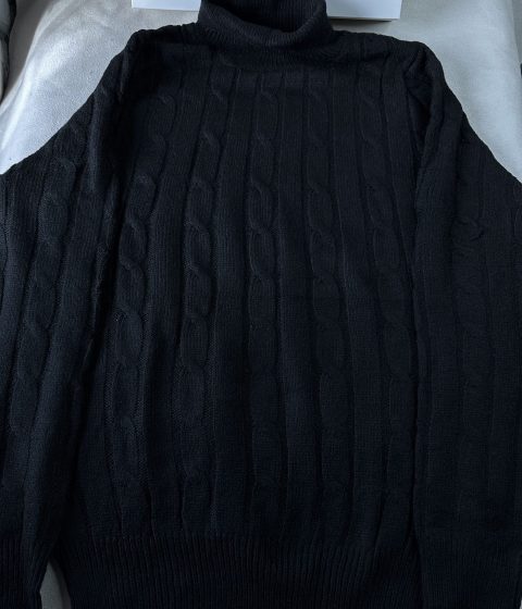 Black cable knit turtleneck sweater